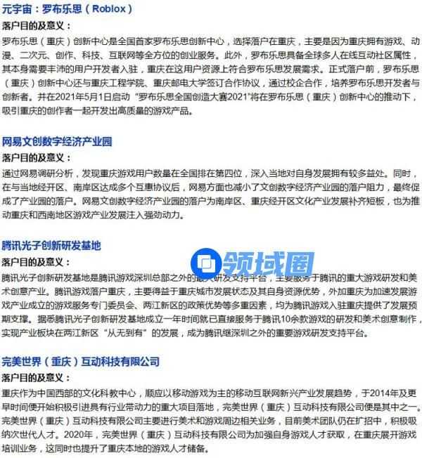 政策支持方面,重庆的力度也非常大。2021年4月,国家商务部发布了《重庆市服务业扩大开放综合试点总体方案》,其中“主要任务和措施”中的第8条为“支持重庆积极创造条件申请开展属地网络游戏审核试点。”也就是说,重庆有机会成为海南之后第二个拥有网络游戏审核权的试点城市。这一试点的落地不仅为重庆本土的游戏企业提供版号获取便利,也会影响到其他地区游戏企业向重庆的迁移,加速当地的游戏产业发展。而对于游戏企业而言,及时获取游戏版号将有利于其产品及时上线,补充自身流动资金,提高生存能力,也能降低产品真空期的压力。近年来,越来越多的大型游戏企业开始重视重庆地区游戏产业的发展前景,纷纷落户于重庆。同时,基于重庆地区对游戏产业发展的鼓励态度与福利政策,游戏企业切实从中获益,这也进一步促进了游戏企业的入驻。而大型游戏企业的入驻,一方面给当地整体游戏发展带来了大量经验与资源,加速地区产业升级;另一方面也起到领头羊作用,吸引更多游戏企业落户与成立。
