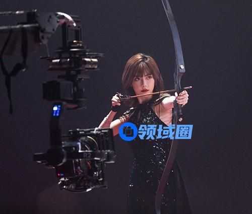 镜头下的周姐眼神坚定,披肩的卷发搭配黑色亮片吊带裙,手举弓箭,简直又A又飒!认真起来的周姐美的不可方物~果然还是不张嘴的周姐最美!