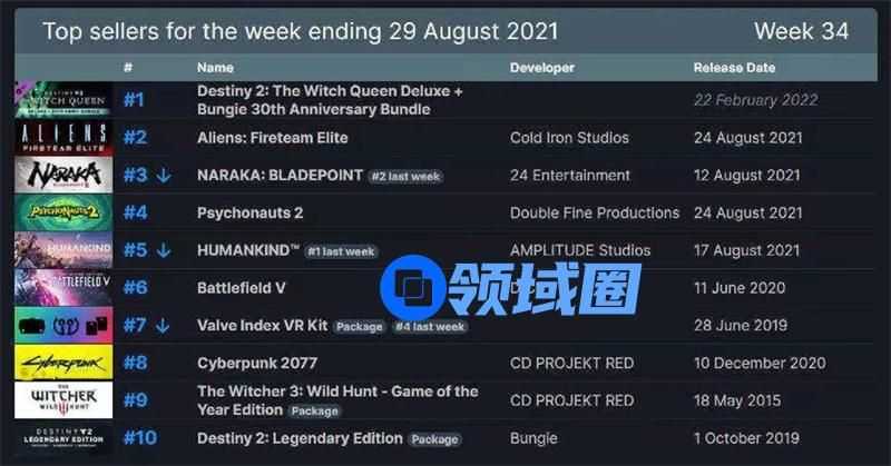 此外,《命运2》全新DLC邪姬魅影豪华版+Bungie30周年纪念组合包,也在8月23日~8月29日期间成功登顶Steam销量排行榜,向外界充分展现了游戏强大的生命力!