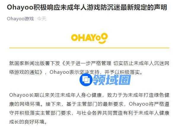 在新规公布后,今日,字节跳动旗下休闲游戏发行品牌Ohayoo发布公告表示,“Ohayoo表示坚决支持,并予以积极落实。”