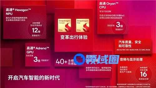 骁龙至尊版汽车平台采用了专为汽车定制的高通Oryon CPU,搭配高通Adreno GPU,旨在实现两方面的3倍性能提升;新平台还搭载高通Hexagon NPU,AI处理器旨在实现12倍性能提升。