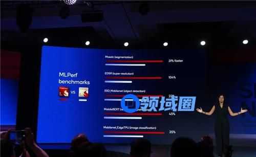 与上代相比,骁龙8至尊版的NPU性能提升了45%,能效也有45%的提升。综合AI性能方面,通过MLPerf BenchMarks测试,对比第三代骁龙8,骁龙8至尊版提升更是最高达到104%(EDSR超分)。