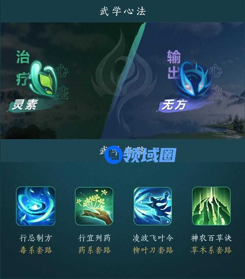 药系套路“行宜列药”:使用内力催动药草,巧妙利用药性搭配,远程治疗友方目标,是主要的治疗套路。