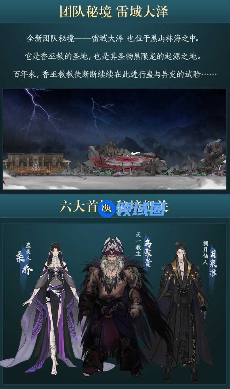 与此同时,全新团队秘境“雷域大泽”也将于全新资料片“北天药宗”中正式登场!“雷域大泽”也位于黑山林海之中,它是香巫教的圣地,也是其圣物黑陨龙的起源之地。这是一片被毒瘴包围的旷大沼泽,空中常年阴云密布、雷电交加,受黑陨龙的影响,许多植物、动物发生了异变。百年来,香巫教教徒断断续续在此进行蛊与异变的试验……在“雷域大泽”秘境中侠士需要面对六位首领,诸多令人熟知的反派也会聚集于此,以待各位前往挑战!
