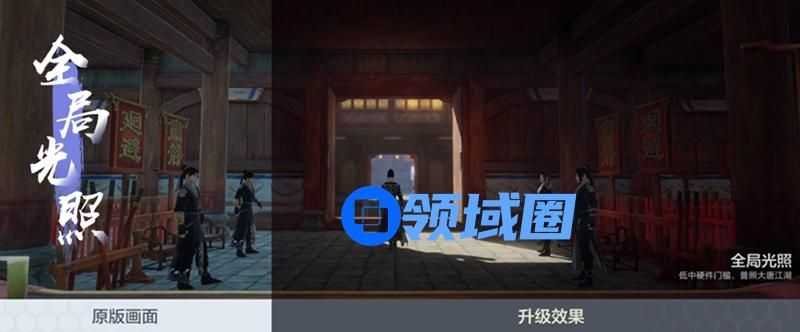 首先是全局光照实时动态效果。此前使用的全局光照覆盖范围较小,在技术革新后,新的全局光照无需光追硬件,全实时、全动态,能覆盖几公里的视距范围,提升画面的层次感和表现效果,画质突飞猛进,江湖焕然一新!