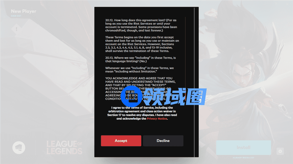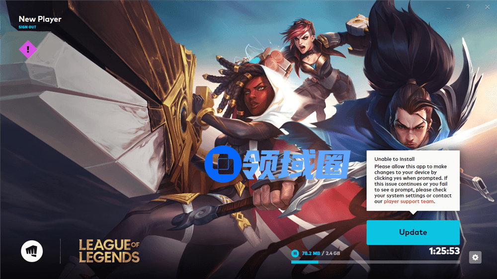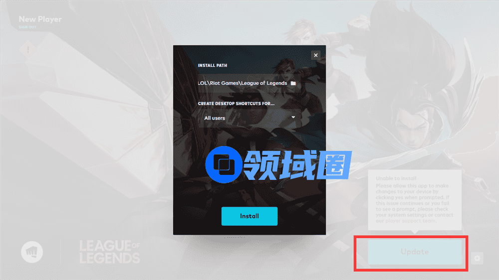5.点击Install(安装)/Update(更新)更新LOL到最新版本(如中途退出,再次打开客户端重新登录即可自动开始下载更新)