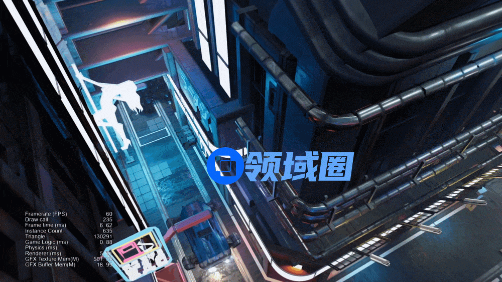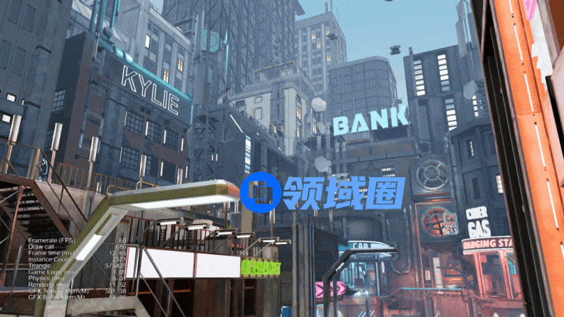 而 overdraw 调试渲染模式的使用让手机端也可以很流畅地运行赛博朋克这样宏大的 3D 场景,在这个渲染模式下,可以轻易地看出哪些像素是被重复绘制了多次。利用这个特性,调试出当摄像机处于城市中央的时候,很多建筑即使被其他建筑遮挡了依然会被渲染,这就浪费了很大一部分性能。然后通过预计算的遮挡剔除方法,就几乎没有性能消耗。类似这样的细节优化还有很多处。