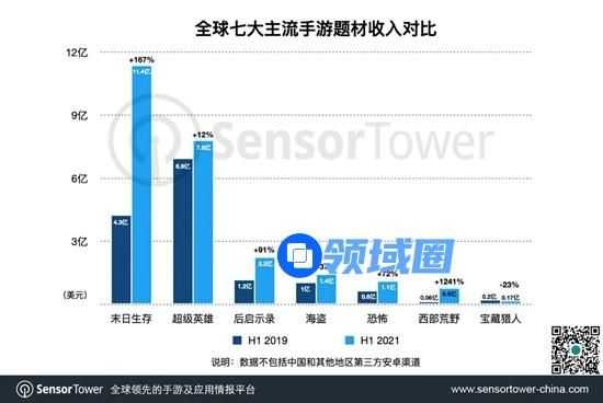 在中东市场上,末世类题材手游也非常受欢迎,这几年增长迅猛。据Sensor Tower数据,相比2019年上半年,2021年末世题材手游市场规模11亿美元,增长了167%,是诸多流行题材中最为吸金的。