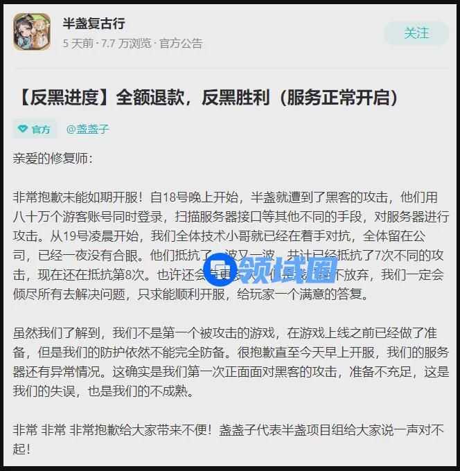 只是这种程度的曝光显然不足以让黑客们停手。时间过去还不到两周,十字星工作室的《半盏复古行》同样在开服当天遭到了DDoS攻击。