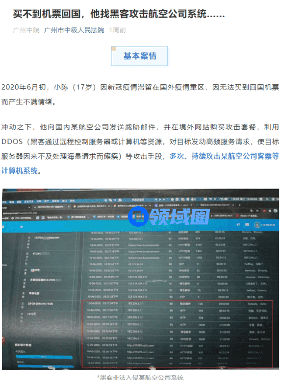 不久前广州市中级人民法院就通报了一起17岁少年仅靠购买的DDoS攻击套餐,就使得国内航空公司票务系统瘫痪的案件