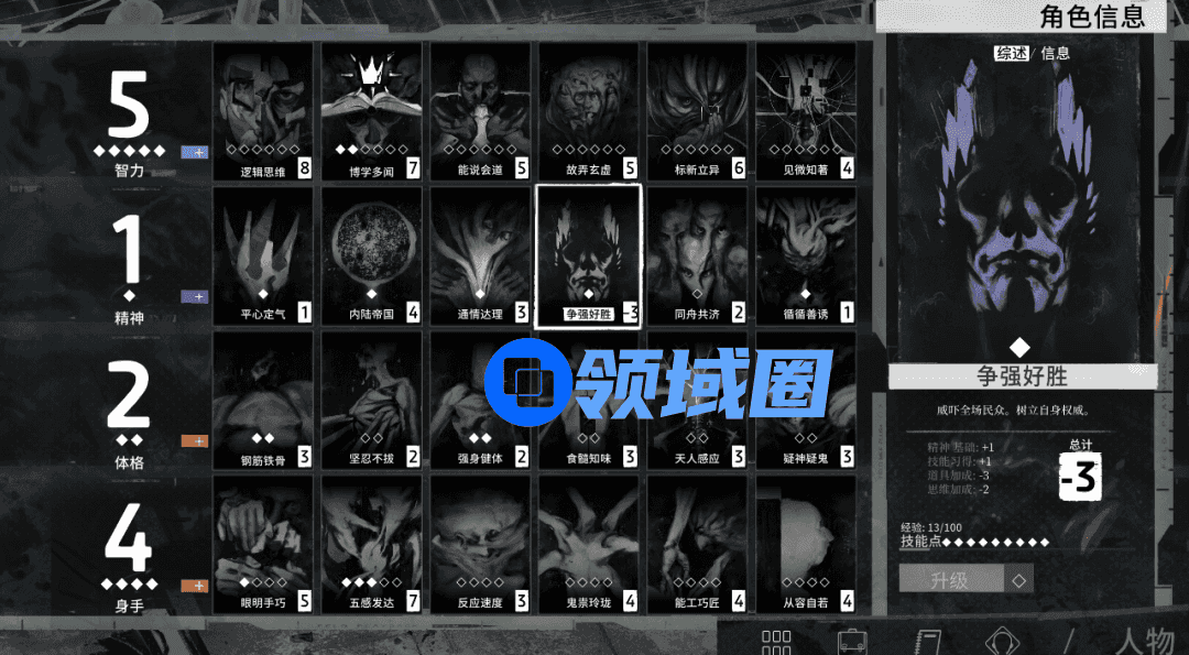 《极乐迪斯科》一个非常有游戏特色的设定是主角的“大脑”,由两部分构成——24个不同方向的思维技能,以及可以选择性内化的思绪词条。