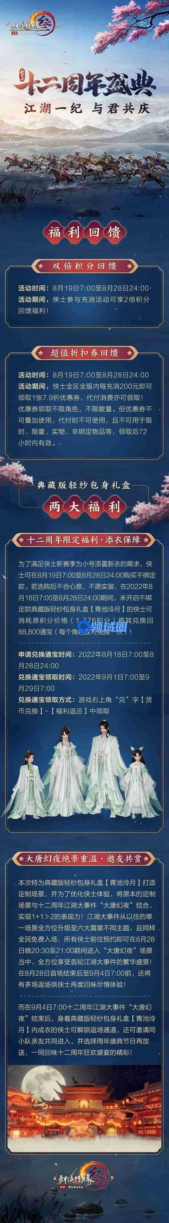 十二载江湖路与君同度,周年豪礼回馈自当不负!自2009年8月28日公测至2021年12月31日,十二年内每位侠士在《剑网3》全区全服所有点卡、通宝消费均累积计算,游戏币购买时长同样有效,并可根据消费金额免费领取对应档位的回馈奖励!当然还请侠士注意,本次回馈依旧是同账号下全区全服仅有一名角色可以领取,侠士们可要留心不要领错哦!