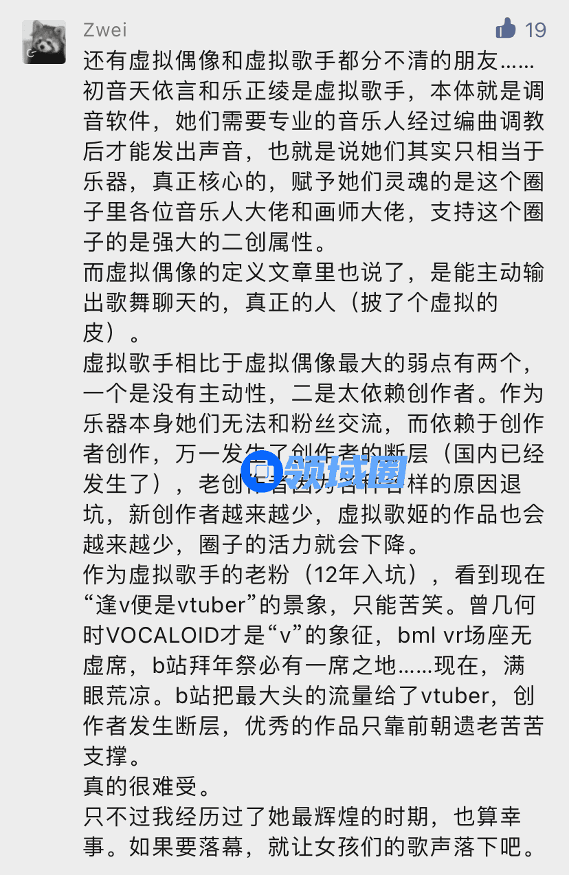 当然,当时评论区的许多读者也表达了自己对两者的一些界定,甚至还包括「虚拟歌姬」「虚拟角色」「虚拟偶像」这三者间的讨论。