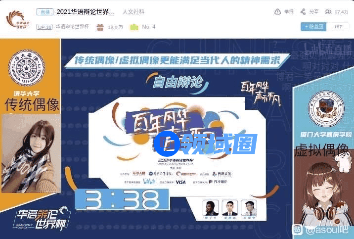 由国际关系学院、人民日报、环球人物杂志社、华语辩论世界杯组委会共同主办的2021年华语辩论世界杯小组赛今天在B站开启了同步直播,今日的两大辩题之一便是「传统偶像/虚拟偶像更能满足当代人的精神需求」。