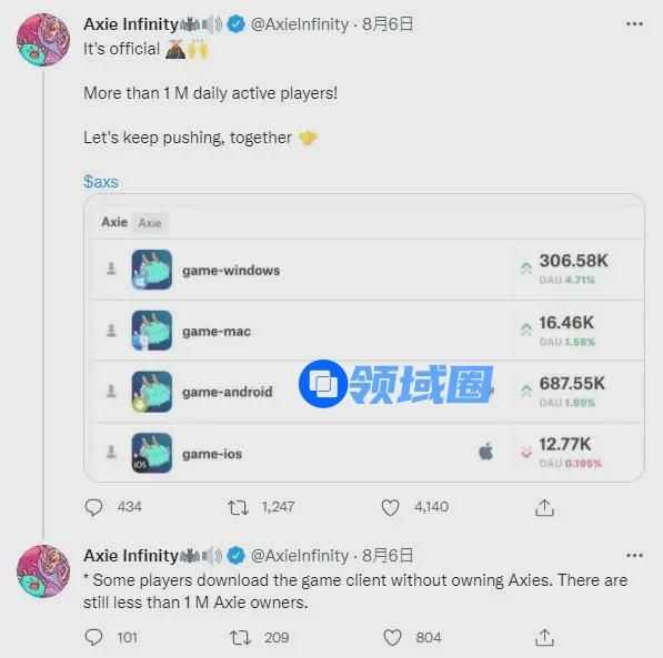 还没完,在8月6日,官方再次在推特宣布游戏的DAU,正式突破100万。或许在一些人看来,100万似乎并不算太牛X,在一些老牌游戏中这个DAU数字甚至还要高许多。