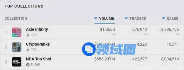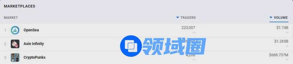 与此同时,NFT分析网站DappRadar的数据显示,Axie Infinity目前的交易总额已经突破了12亿美元,交易总量接近280万次,位列NFT游戏排行榜首位。而在NFT市场交易额排名中,游戏也仅次于OpenSea,位列交易榜第二。
