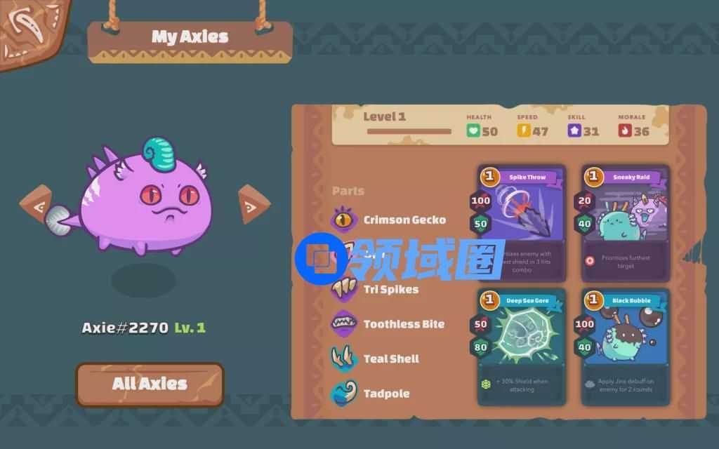 除了拥有不同的定位外,每个Axie还各自拥有四个基础属性(血量、士气、速度、技能),六个身体特征(眼睛、耳朵、角、嘴、背部和尾巴),以及四张技能卡槽。