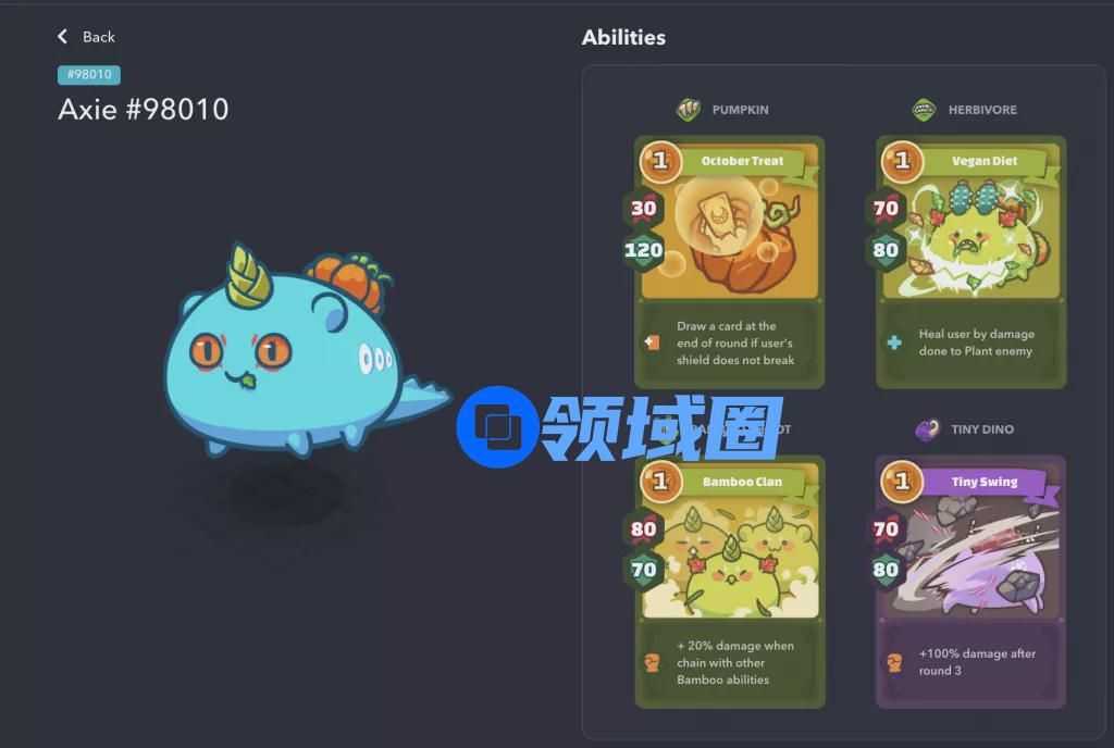 先来看战斗系统方面,最为核心的自然是作为战斗主角的Axie。每一个Axie都具备各自不同的特征,这些特征不仅体现在了Axie的外形和定位方面,更是体现在角色的颇为复杂的数值上。