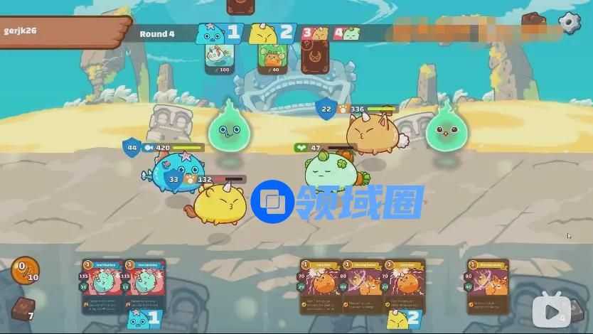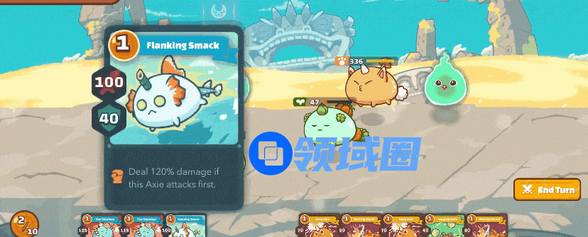 和许多回合制卡牌游戏相似,Axie Infinity的战斗需要组建一个3“人”小队,根据每个Axie的速度不同,对应角色的上场顺序也不同。而一些在速度方面有优势的Axie,还能通过抢占出场顺序,借助一些眩晕的技能卡来打断对方的进攻。