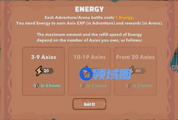 玩家每天拥有20点体力值,拥有更多的Axie将会提升玩家的体力值上限,最高可获得额外200%体力值,体力的上限决定了玩家一天能够获得的经济收益。就目前而言,在不计算PVP胜利的情况下,玩家每天通过任务能够获得的固定SLP为75个,结合市场交易价格,收益大概为100元人民币。