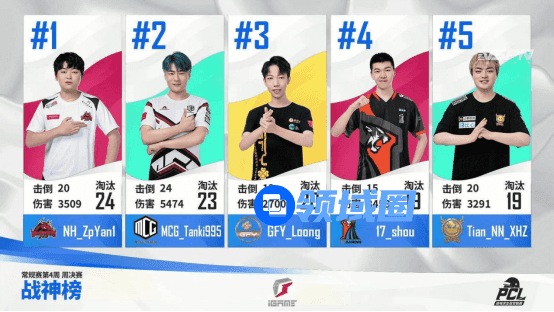 本周周决赛中,NH战队夺冠的最大功臣当属ZpYan1选手,24个淘汰数也让他荣登本周战神榜的榜手。MCG战队的Tanki995本周王者归来,以23个淘汰数位居次席,其5474点伤害值更是冠绝全场。GFY战队的Loong多次将队伍带入决赛圈,并收获20个淘汰数。上周的MVP——17_shou本周状态不减,获得19个淘汰。战神榜最后一位选手是同样拿到19个淘汰的Tian_NN_XHZ选手。