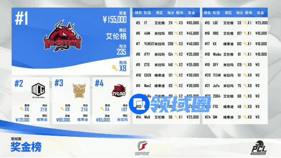 2021 PCL夏季赛常规赛第四周比赛结束已经结束,NH战队凭借本周的3场胜利,以¥155500的奖金领跑总奖金榜,MCG战队、Tianba战队和TYLOO战队紧随其后。常规赛仅剩最后一周的时间,而周决赛的吃鸡奖金将提升为¥30000一局,这也意味着排名靠后的队伍若能闯入周决赛并吃到一鸡,就有很大可能晋级季后赛。第五周的比赛将于8月17日(周二)18点开始,各支战队将向季后赛门票发起最后的冲击。第五周周冠军花落谁家,又有哪些队伍闯入季后赛,让我们拭目以待!