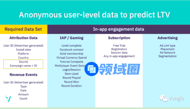 由算法驱动的系统不需要流量源或广告campaign ID来预测 LTV。“获得收入的事件”和“应用内用户互动数据”这两部分对于算法预测 LTV必不可少,且后者对于预测转化率尤其重要。