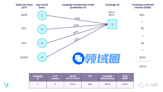 只需一个简单的数学公式,就可以自动分配每个广告campaign和自然安装渠道对收入的贡献。下图为一个数学模型示例。在该模型下,将用户层级的 LTV 预测与广告campaign归属概率相乘,即得出每个广告campaign带来的安装对广告campaign预测的收入有何贡献。该模型将所有概率大于0%的安装带来的收入预测相加,就能得出广告campaign预测的收入。通过计算广告Campaign 1在广告平台上的花费(即图中的100美元),我们就能得出广告campaign的pROAS。