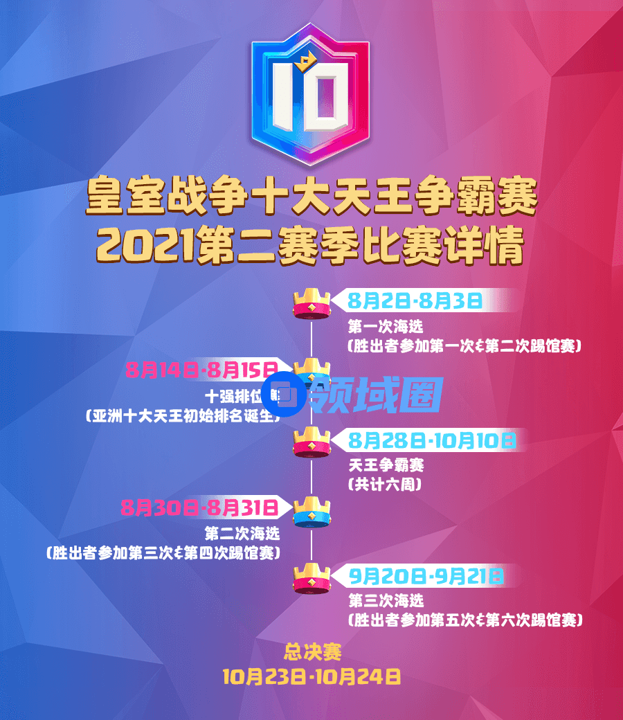 精彩纷呈的皇室电竞下半赛季,就从本周末的CRSC第二赛季拉开序幕!8月14日—15日(本周六至周日)每天17点,2021皇室战争十大天王争霸赛CRSC第二赛季震撼回归、全球首播,全亚洲最顶尖的十位高手蓄势待发、竞逐巅峰,未来的三个月里,几乎每个周末都有亚洲天王们与你相伴,锁定CRSC直播,让我们一起见证亚洲最强天王的加冕!