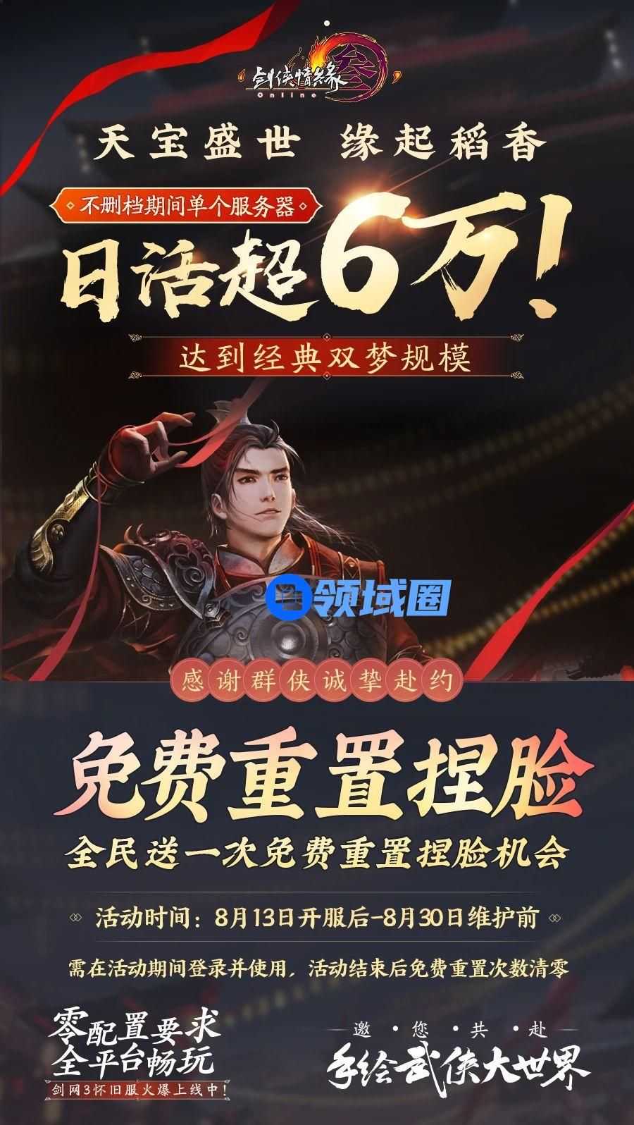 《剑网3》怀旧服上线火爆,截至目前,天宝盛世、缘起稻香两大服务器单服日活已超6万,达到经典双梦镇规模!为感谢各位侠士的支持与陪伴,8月13日开服后-8月30日维护前,《剑网3》怀旧服将全民赠送一次免费重置捏脸的机会,届时侠士可前往商城“易容”板块重新定制自己喜欢的脸型!机会难得,经典手绘的千面佳人等你来创!