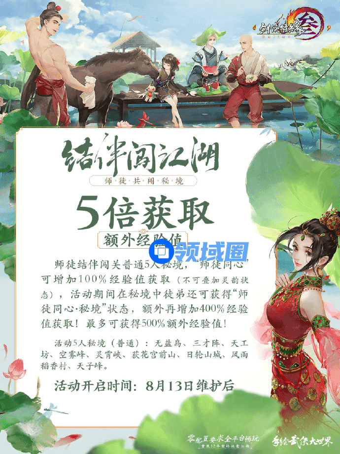 师徒同心,其利断金,《剑网3》怀旧服“结伴闯江湖”活动今日开启!为帮助萌新侠士快速进入江湖,8月13日维护后,师徒结伴闯关普通5人秘境,徒弟可获得“师徒同心·秘境”状态,额外增加400%经验值获取;叠加可增加100%经验值获取的“师徒同心”状态,最多将能获得500%额外经验值!