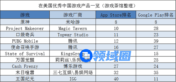 在本期榜单上,《原神》和《State of Survival》分别是出海美国和德国的中国游戏中收入最高的。其中《原神》分别排名美国App Store畅销榜第八名。