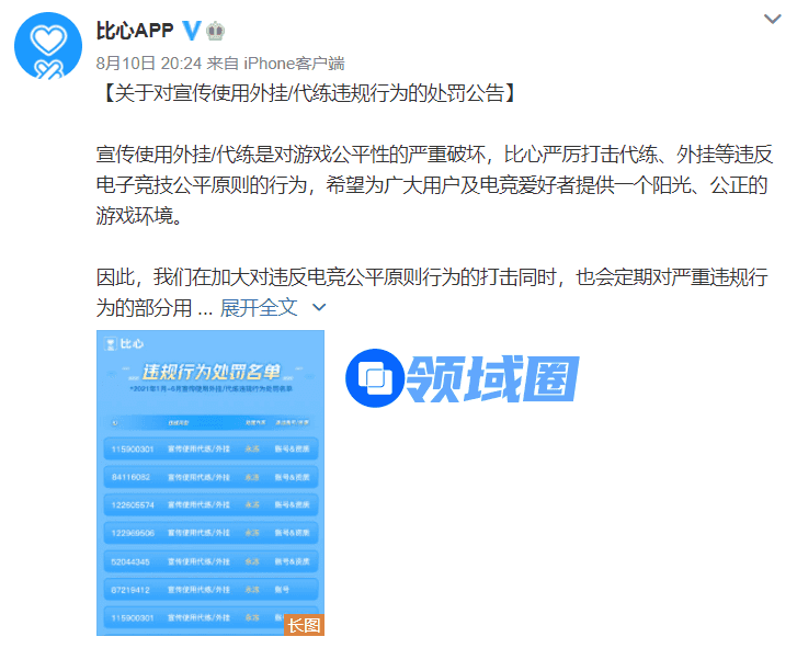 因此,打击宣传使用外挂/代练行为也成为各游戏厂商及电竞平台高度重视的生态治理行为。近日,电竞生态聚合平台比心公布了2021年上半年违规使用/宣传外挂处罚名单,对平台用户在游戏过程中宣传/使用外挂行为进行账号封禁处罚公示。