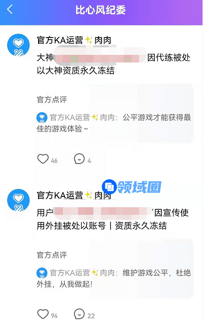 作为电竞产业衍生新业态,这并不是比心首次进行针对外挂违规行为的整治行动。经了解,在比心平台专设有名为“比心风纪委”版块,用于公示包括代练/宣传使用外挂等在内的违规处罚行为。据用户反馈,比心平台规则一直非常严格,尤其对于使用外挂或者代练等行为更是不能碰的红线。