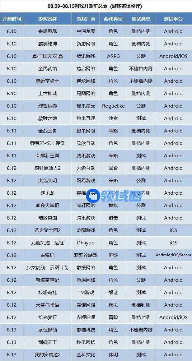 剩下的休闲类、回合类、冒险类、Roguelike类、射击类、ARPG类和沙盒类游戏将各有1款下周开测。bilibili的冒险类游戏《拾光梦行》、金科的休闲类游戏《我的安吉拉2》和腾讯的ARPG类游戏《真·三国无双 霸》和射击类游戏《暗区突围》都比较值得推荐。