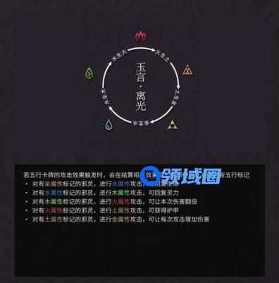 玩家会拥有金木水火土五种属性的卡牌,对邪灵使用时,会将伤害卡牌的属性附加给邪灵,再次使用相邻属性的卡牌攻击,会触发特殊效果。