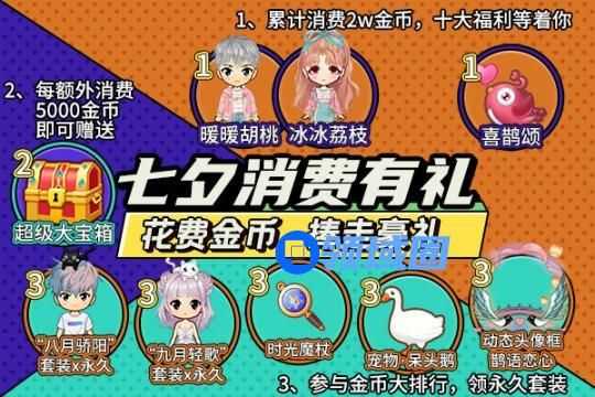活动期间,您累计消费的金币越多,在活动期间可领取的奖励也越多!当累计消费20000金币后,每额外消费5000金币,即可获赠1份“超级大宝箱”!除此之外,玩家累计消费的金币越多,在“甜蜜排行榜”上的名次越高!活动结束后,根据您的排名,获得对应奖励,包含永久套装:八月骄阳、九月轻歌,宠物·呆头鹅等豪华奖励!