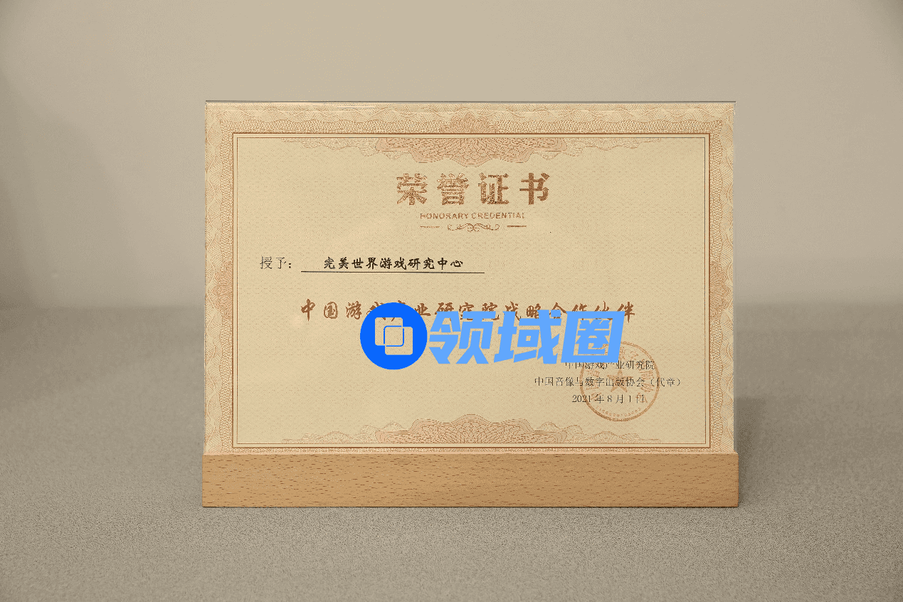 (图为完美世界游戏研究中心获授的“中国游戏产业研究院战略合作伙伴”荣誉证书)