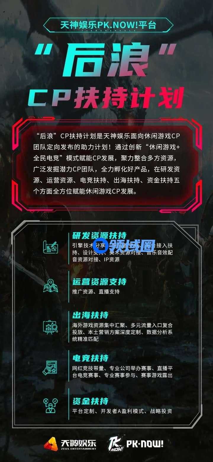 7月29日,在“赋能CP 文化出海——2021休闲游戏产业发展与文化传播论坛”上,甄琦代表天神娱乐正式公布了《“后浪”CP扶持计划》,计划旨在通过PK.NOW!平台专业赋能,聚力整合多方资源,广泛发掘潜力CP团队,全力孵化好产品,在研发资源、运营资源、电竞扶持、出海扶持、资金扶持五个方面全方位赋能休闲游戏CP发展。