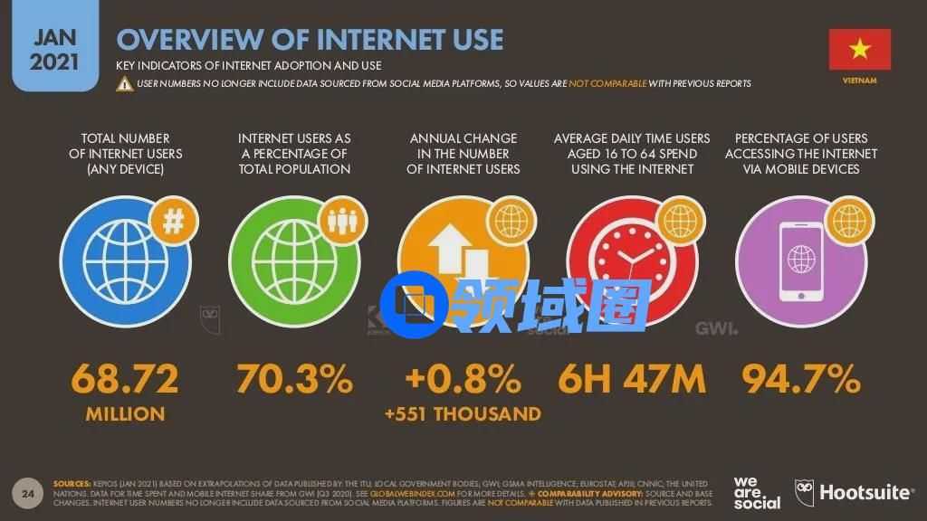 2021 年 1 月越南越南网民为 6872 万人,占总人口的 70.3%