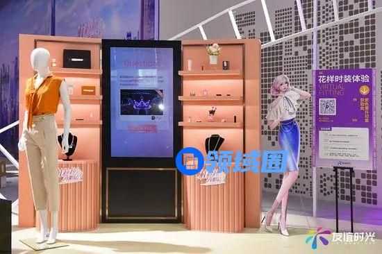 友谊时光展台以粉色为主色调,正中央被布置成都市女性的衣帽间,首饰、女士包、香水以及各种时装一应俱全。中央背景墙是都市高楼大厦的剪影,与游戏的都市职场题材遥相呼应。