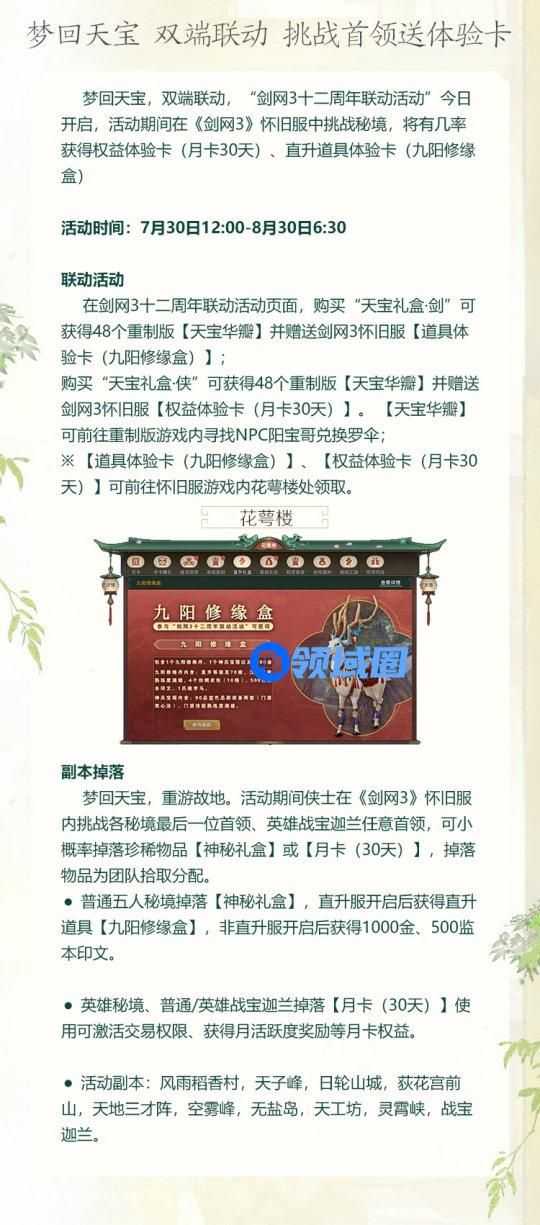 梦回天宝,双端联动,“剑网3十二周年联动活动”今日开启!7月30日开服后至8月30日维护前,侠士可前往联动活动专题页面购买“天宝礼盒”,不仅能获得《剑网3》重制版用以兑换罗伞挂件的代币【天宝华瓣】48个,还送绑定款《剑网3》怀旧服权益体验卡/道具体验卡(二选一,为账号绑定)!除此之外,活动期间侠士在《剑网3》怀旧服中挑战秘境,可小概率珍稀掉落【权益体验卡(月卡30天)】或【道具体验卡(九阳修缘盒)】,使用后可激活对应权益。