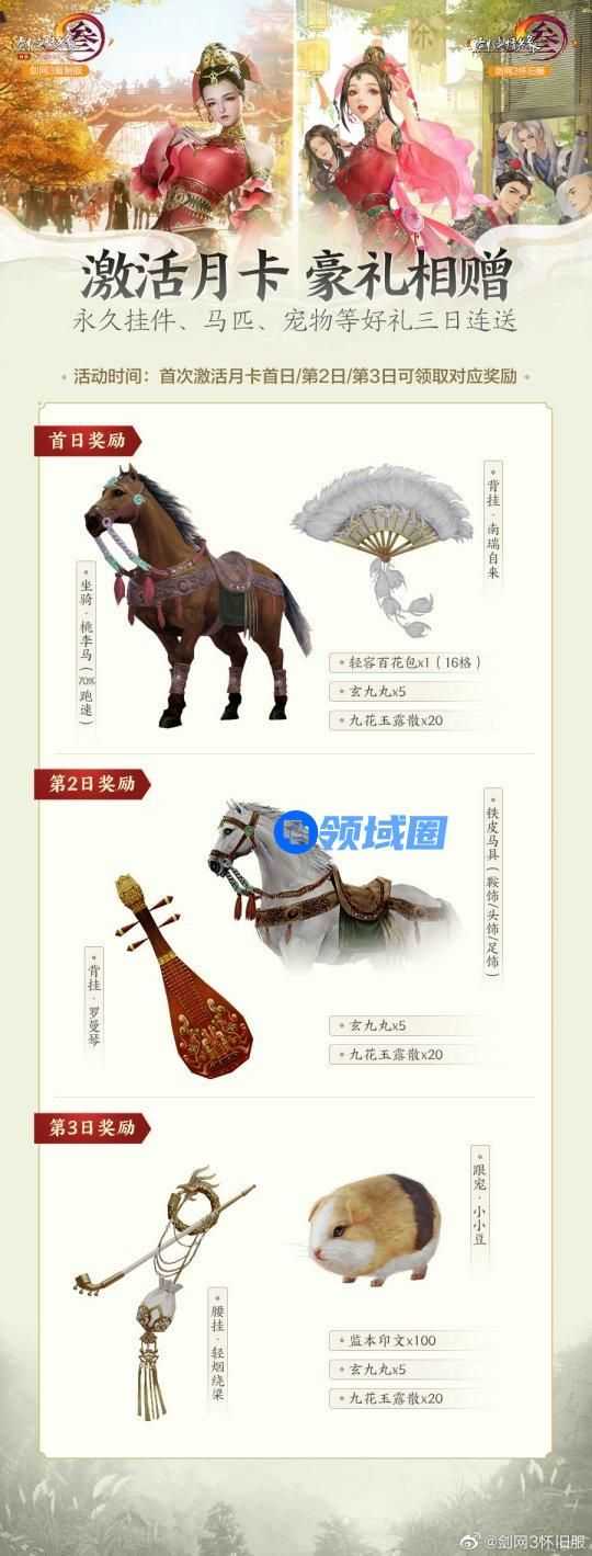 激活月卡还有豪礼相赠!7月30日开服后,首次激活月卡的侠士,可在激活后首日、次日、第三日领取对应奖励,永久背部挂件挂件【南瑞自来】、马匹【桃李马】、宠物【小小豆】等12件好礼3天连送!