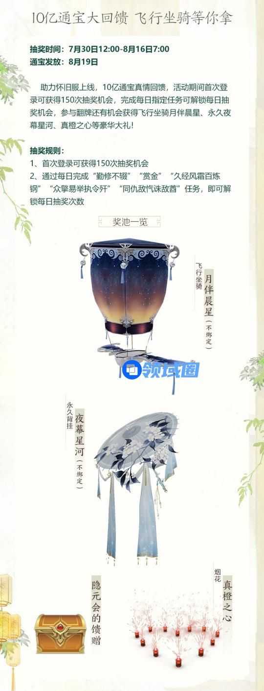 感恩陪伴,回馈热爱,《剑网3》怀旧服上线后将送出10亿通宝!7月30日开服后-8月16日维护前,侠士参与翻牌活动就能瓜分10亿通宝,还有机会获得飞行坐骑【月伴晨星】、绝版挂件【夜幕星河】等豪华大礼!活动期间,首次登录游戏可获得150次抽奖机会,完成每日指定任务即可参与抽奖!