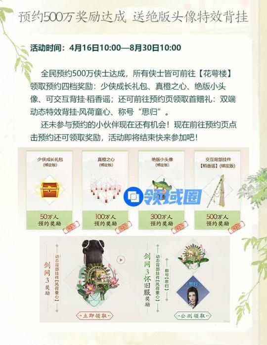 稻香风起,邀君赴约,《剑网3》怀旧服4月16日开启预约,截止目前预约人数已突破500万!所有参与过预约的侠士均可领取四档奖励,包含绝版小头像【缘起·青荷】、可交互背部挂件【稻香谣】!即刻前往预约,还可领取双端动态特效背挂【风荷童心】、绝版称号【思归】!