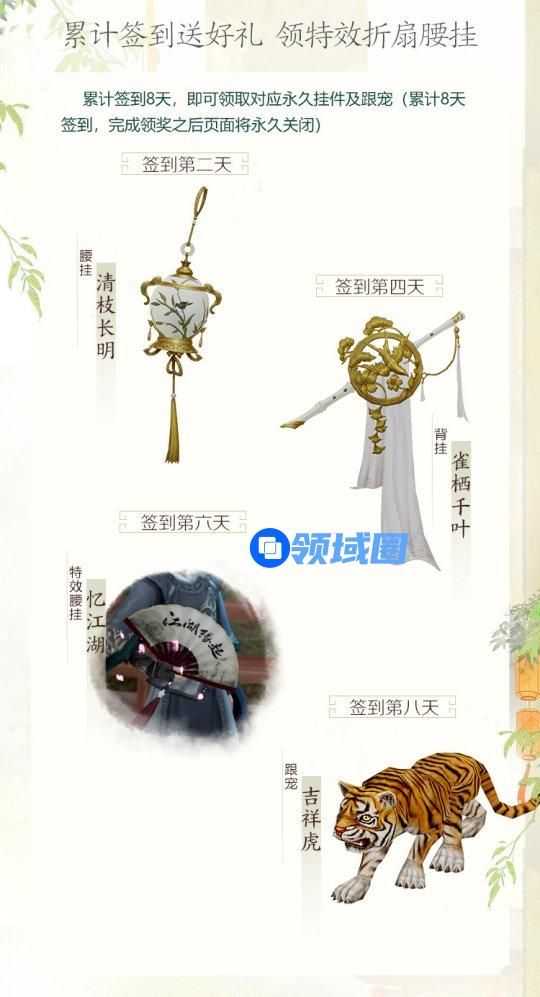 勤修不辍,签到不停,永久跟宠挂件全民赠送!7月30日开服后,侠士登录游戏进行签到,每日都可领取对应奖励!累计签到6天,即可领取周深MV同款特效折扇腰挂【忆江湖】,挂件使用后会有对应开扇动作,俊朗飘逸,同时幻蝶围绕周身,尽显无限柔情!累计签到8日,更有永久跟宠【吉祥虎】相送,侠士可别错过!