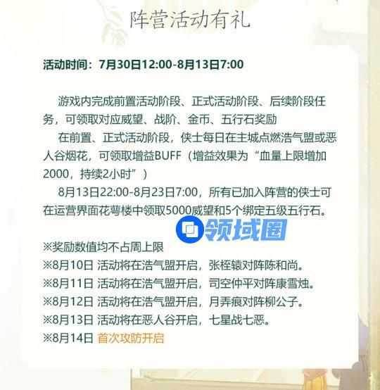 两大阵营正广纳贤士,组织了多样活动静待诸位侠士参与!7月30日开服后-8月13日7:00,侠士可在游戏内根据指引参加阵营活动任务,完成后可领取威望、战阶、五行石等奖励!