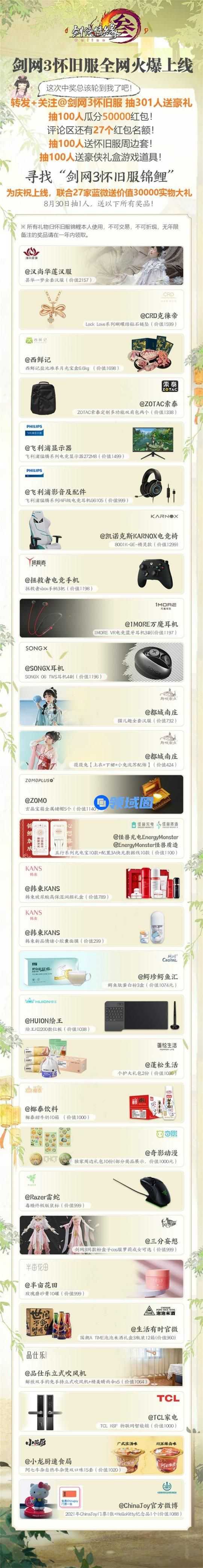 喜迎《剑网3》怀旧服全网上线,微博亦准备了精彩的福利活动,逆天奖品礼单今日曝光!即刻前往微博@剑网3怀旧服 转发并关注,就有机会瓜分20000红包,获得掉落的怀旧服周边套和豪侠礼盒!更有27家蓝v联合寻找“剑网3怀旧服锦鲤”,8月30日抽1人送出价值30000+的豪华大礼!速速前往微博参与抽奖,把逆天好礼领回家!