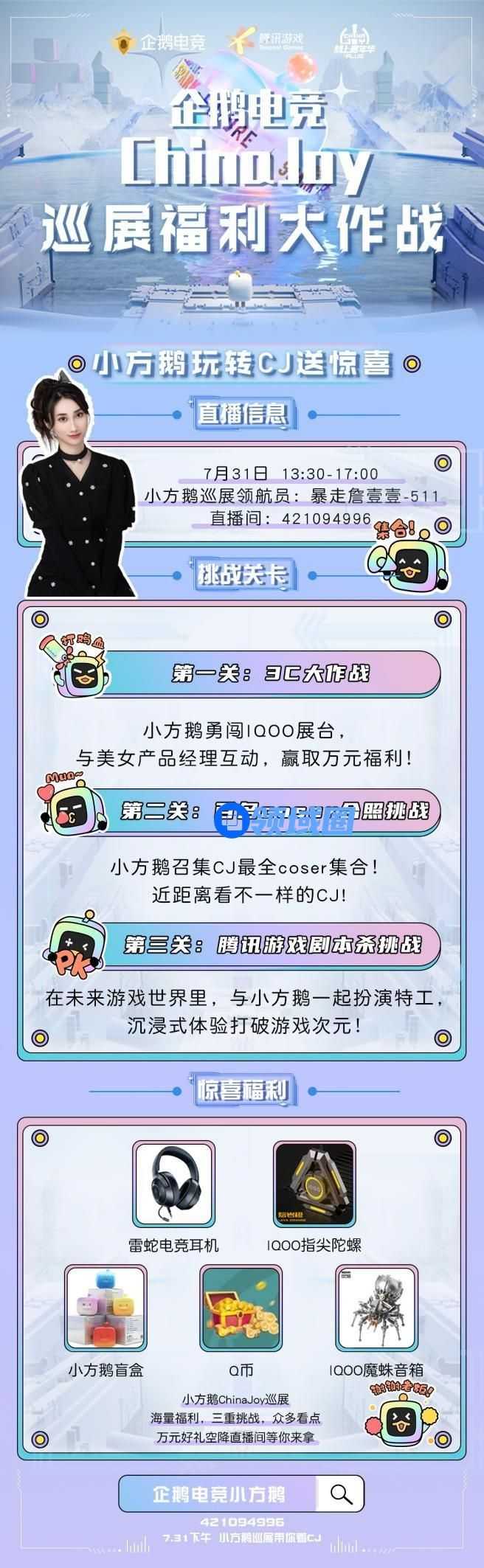 最后也是最重要的一点,小编还要提醒大家:小方鹅巡展活动将于7月31日13:30于企鹅电竞小方鹅直播间开始(直播间号:421094996,重要的事情要说两次!)。趣味关卡挑战,超多福利掉落,更有海量实物奖励放送。