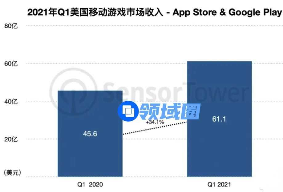根据Sensor Tower 商店情报数据显示,2021年Q1季度美国手游在App Store和Google Play的总收入超过61亿美元。较2020年Q1增长34.1%,占全球App Store和Google Play手游总收入的27.5%。超1/4的收入占比,让美国市场成为中国厂商出海的重要阵地。